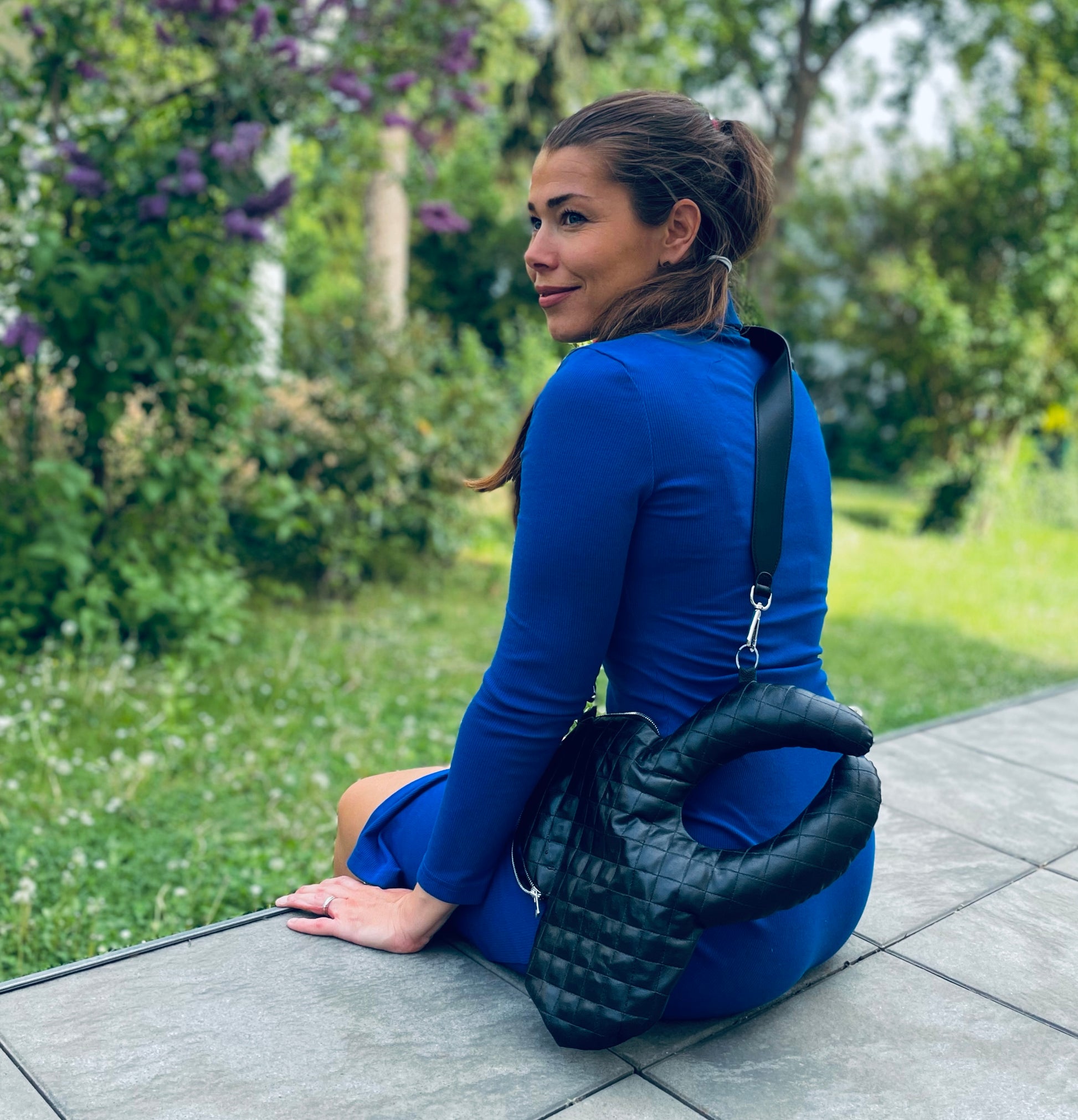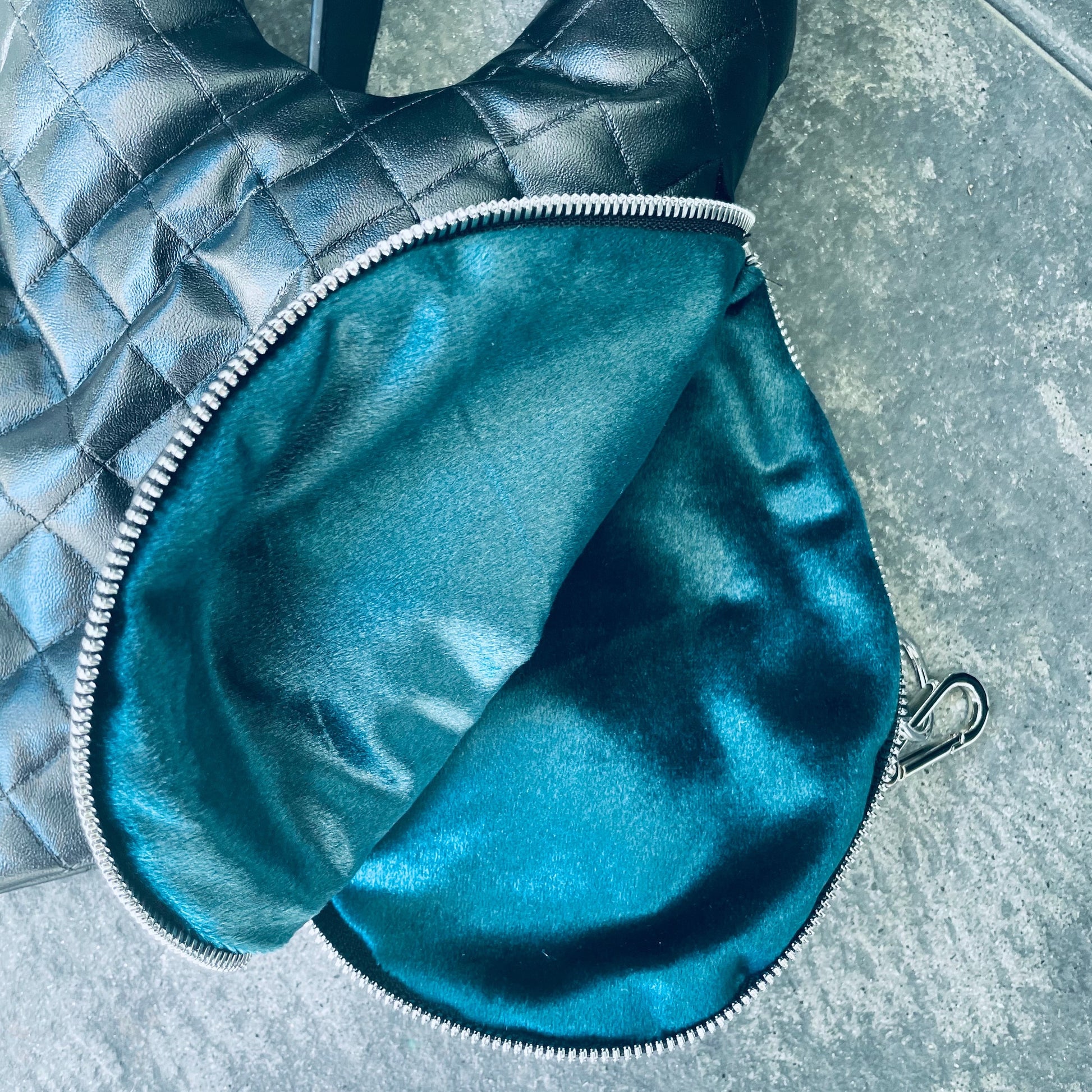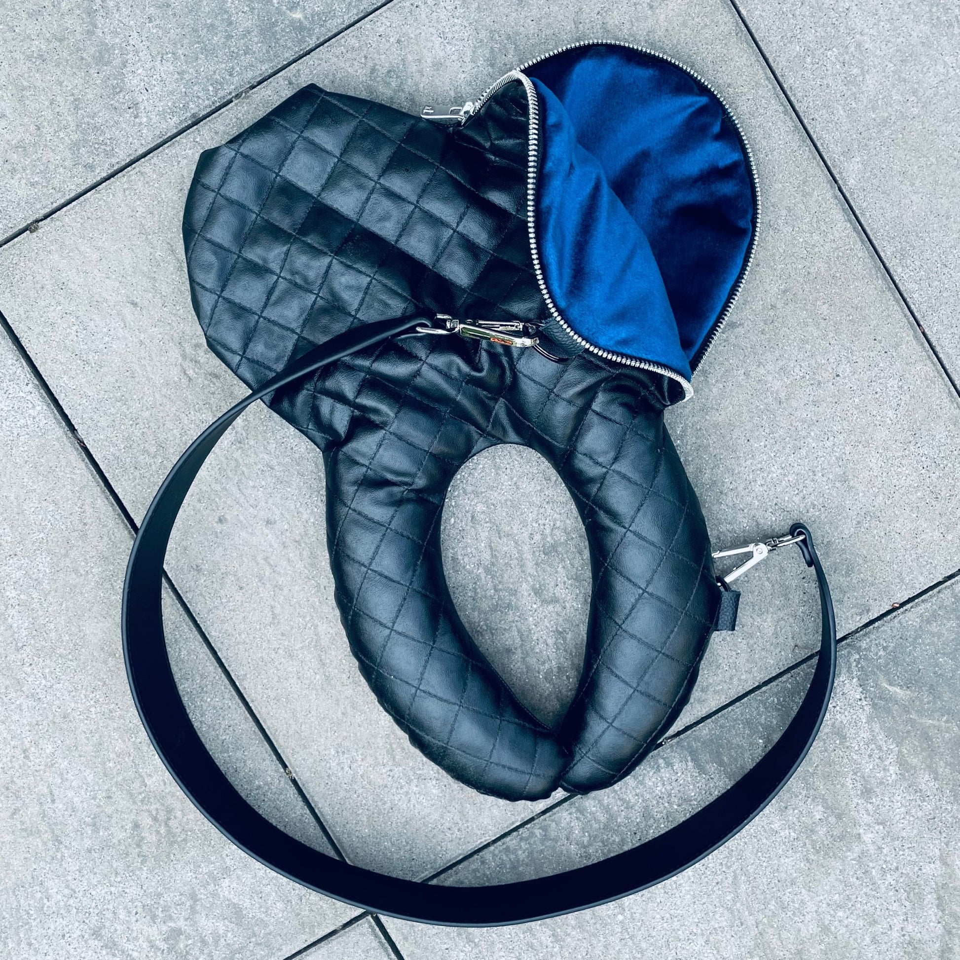 schwarz gestepptes veganes Leder mit velvet Innenfutter, Riemen 77cm lang.